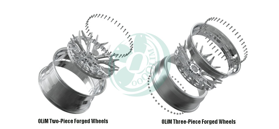 OLiM 3-osaiset taotut pyörät ovat mukautetun taiteen mestariteoksia. Keskilevy, sisäpiippu ja ulkohuuli ovat erillisiä osia, jotka on koottu huolellisesti ilmailukäyttöön tarkoitettujen pulttien ja patentoitujen tiivistysratkaisujen avulla. Jokainen osa voidaan räätälöidä itsenäisesti.